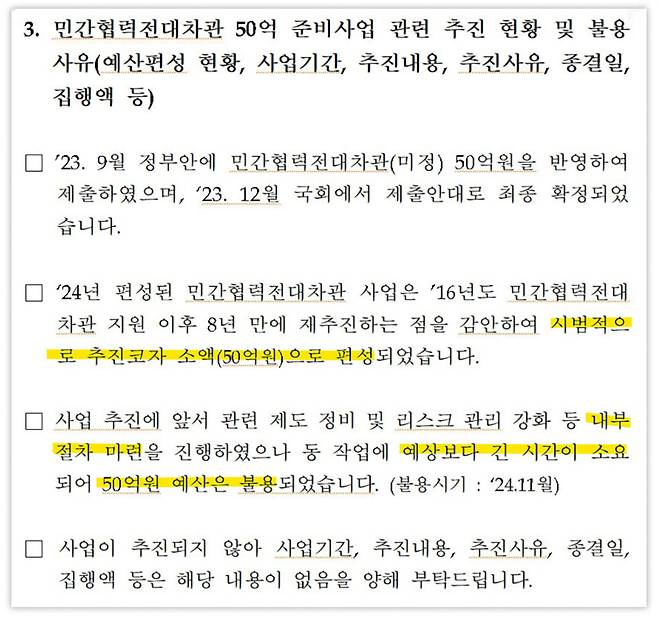 그렇게 신속 집행됐기 때문일까요, 최근 수은이 차츰 내놓는 답변들을 보면 이 사업이 얼마나 졸속으로 추진됐는지가 여실히 드러납니다. 앞서 밝혔듯 지난 2024년 편성된 민간협력전대차관 예산은 50억 원이었습니다. 2016년 이후 8년 만에 처음 추진되는 사업이었기에, 시범적으로 소액을 편성했다는 게 수은의 설명입니다.