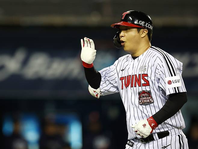 | ▲ 27일 서울 잠실야구장에서 열린 2025 프로야구 한국시리즈 한화 이글스 대 LG 트윈스 2차전. 8회 말 2사 1루 때 LG 문보경이 2점 홈런을 친 후 기뻐하고 있다. |