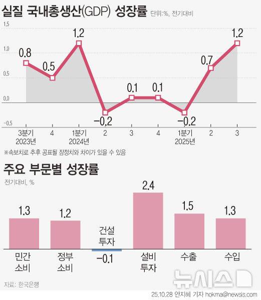 [서울=뉴시스] 올해 3분기 실질 성장률이 1.2%로 1년 6개월 만에 다시 1%대로 반등했다. 민간소비는 2022년 3분기 기록한 1.3% 이후 최대치를 기록했다. 한은은 소비쿠폰 등의 영향으로 음식점 및 의료 등 서비스 소비가 모두 늘고, 승용차와 통신기기 등의 소비도 개선된 것으로 분석했다. (그래픽=안지혜 기자)