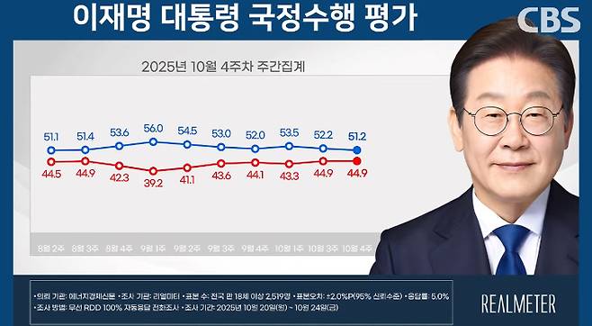 ◇ 김현정> 최민희 의원 자녀 결혼식이 불러온 나비 효과, 아마 우상호 수석에 대통령 자녀 결혼식까지 이제 일파만파로 커져가고 있는 이슈 한번 다뤄봤고요. 이 얘기 좀 해보죠. 어제 리얼미터의 지지율 정례 조사를 보니까 리얼미터가 에너지경제신문 의뢰로 조사한 거고요. 10월 넷째 주 국정수행 지지율인데 대통령의 지지율이 1% 포인트 하락한 51. 2%를 보였습니다. 매우 잘한다가 39. 3%, 잘하는 편이다가 11. 9%, 부정 평가는 44. 9%, 매우 잘못한다 36. 6, 잘못하는 편이다 8. 3%. 자동 응답 전화 조사했고요. 10월 20일부터 24일까지 했고 자세한 내용은 여론조사 심의위원회 홈페이지를 보시면 되는데 지금 1% 포인트 하락한 걸 어떻게 볼 것이냐, 일단은 최저치에 근접했어요. 이재명 대통령 임기 내에 가장 낮았던 게 51. 1인데 이번에 51. 2를 기록했으니까 최저치까지 간 건 맞습니다만 부동산 대책 이후에 악화된 여론을 생각하면 그래도 선방했다는 얘기가 또 나오고 있고 그래서 이 지표를 어떻게 볼 것인가, 어떻게 해석하고 계시는가, 어떤 분 먼저.