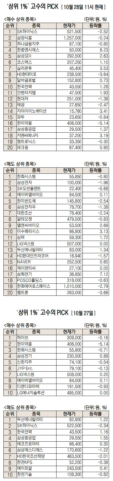 미래에셋증권에서 거래하는 고수익 투자자들이 28일 오전 가장 많이 순매수한 종목은 SK하이닉스(000660), 삼양식품(003230), 하나금융지주(086790), 한중엔시에스(107640) 등으로 집계됐다.
