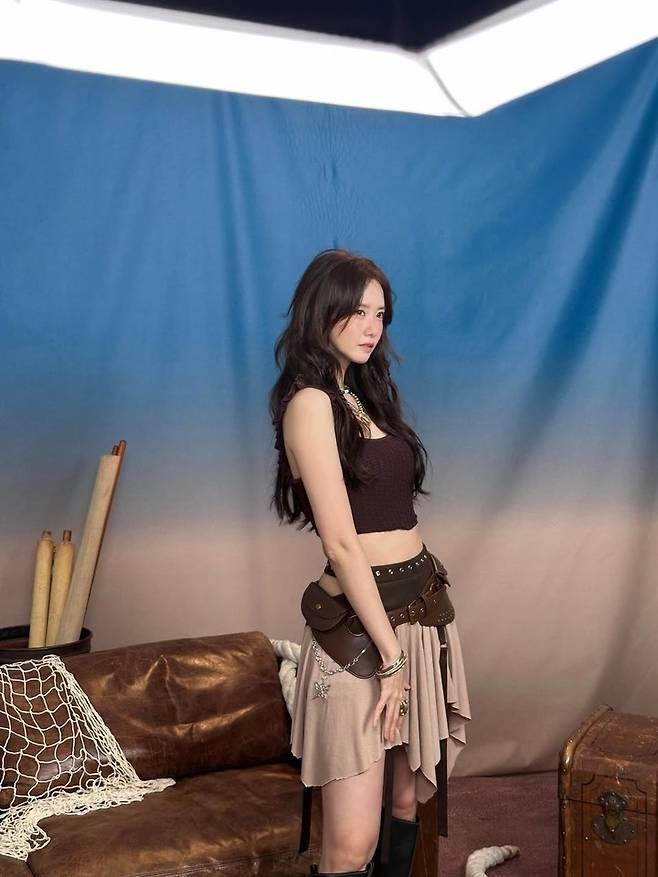 공개된 사진 속 임윤아는 브라운 컬러의 슬리브리스 니트 톱에 언밸런스 스커트를 매치해 '캐리비안 해적'이 떠오르는 빈티지 무드를 완성했다.