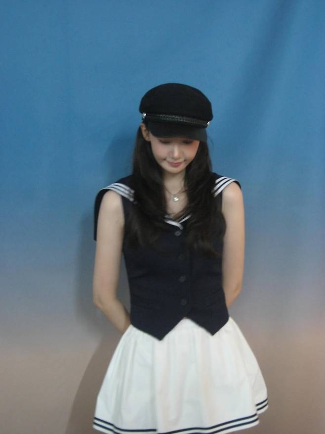 또 다른 사진에서는 네이비 세일러룩 스타일의 미니 원피스에 마도로스 캡을 매치, 청순하면서도 사랑스러운 매력을 발산했다.