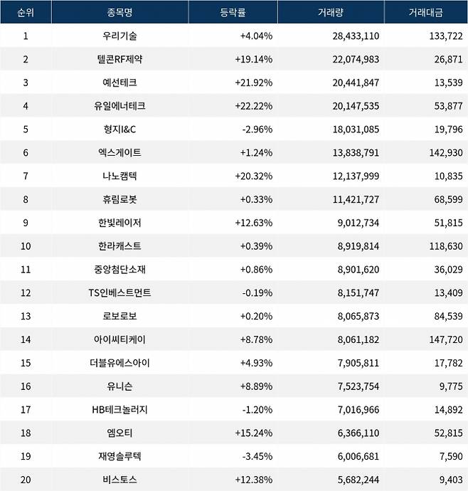 한편 거래량 상위 20위권 종목들은 중앙첨단소재(051980) ▲0.86%, TS인베스트먼트(246690) ▼0.19%, 로보로보(215100) ▲0.20%, 아이씨티케이(456010) ▲8.78%, 더블유에스아이(299170) ▲4.93%, 유니슨(018000) ▲8.89%, HB테크놀러지(078150) ▼1.20%, 엠오티(413390) ▲15.24%, 재영솔루텍(049630) ▼3.45%, 비스토스(419540) ▲12.38% 등의 성적을 기록했다.