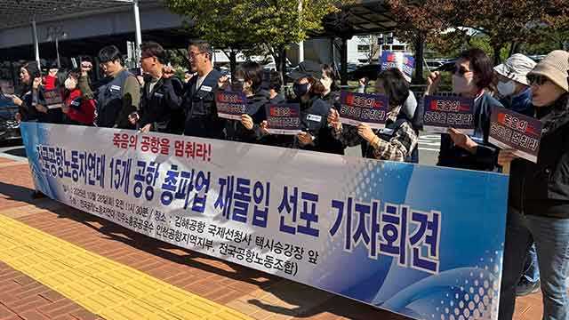 민주노총 공공운수노조 인천공항지역지부와 전국공항노조로 구성된 전국공항노동자연대는 오늘(28일) 오전 부산 김해공항 앞에서 기자회견을 열고 내일 0시부터 무기한 총파업에 돌입한다고 밝혔습니다.