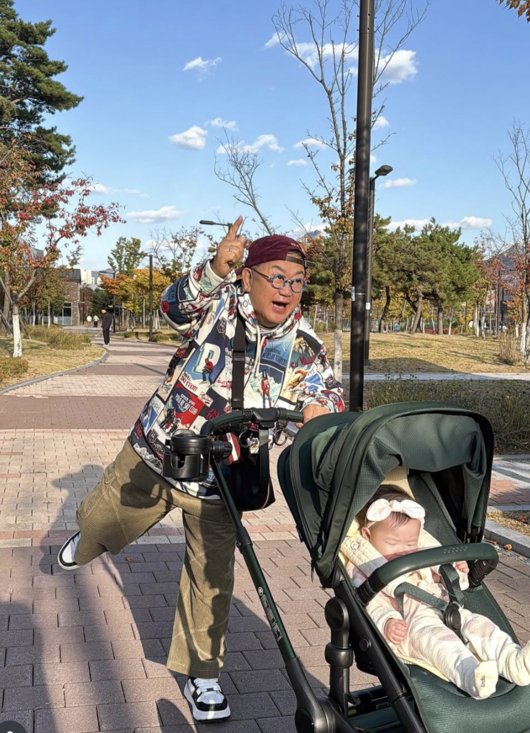 공개된 사진 속 이용식은 손녀를 유모차에 태우고 활짝 웃는 모습. 모자를 거꾸로 눌러쓰고 과감한 포즈를 취하며 한껏 들뜬 분위기를 자랑했다. 반면 손녀는 어리둥절한 듯한 표정으로 앉아 있어 보는 이들의 미소를 자아냈다.