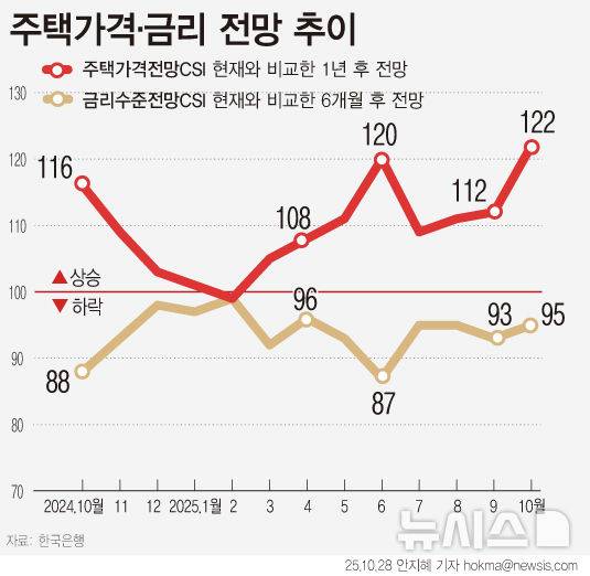 [서울=뉴시스] 정부가 10·15 부동산 대책을 내놨지만 소비자들의 집값 상승 기대는 2021년 10월 수준(125)까지 올랐다. 28일 한국은행이 발표한 '10월 소비자동향조사'에 따르면 주택가격전망CSI는 122로 전월(112)보다 10포인트 상승했다. 주택가격전망CSI는 현재와 비교한 1년 후 전망으로 2003년 1월부터 지난해 12월을 기준값으로 한다. 100보다 크면 낙관적임을 의미한다.