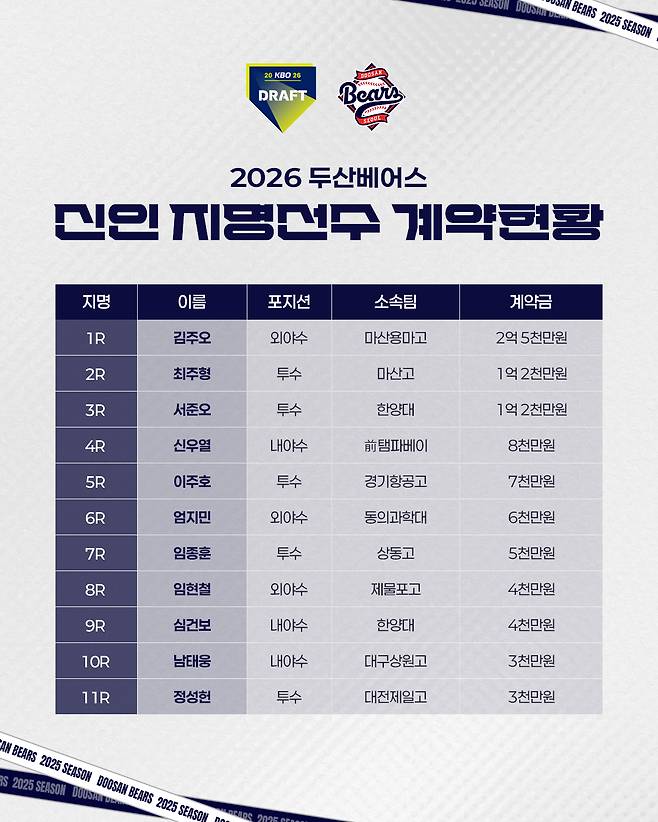 (엑스포츠뉴스 김근한 기자) 두산 베어스가 지명 뒤 41일 만에 2026년 신인 선수 11명과 계약했다. KBO리그 10개 구단 가운데 두산의 신인 계약 소식이 가장 늦었다.
