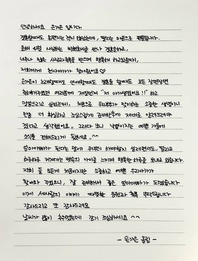 은가은은 28일 자신의 계정에 손편지를 올리고 "결혼할 때도 손편지는 적지 않았는데 떨리는 마음으로 펜을 든다"며 "올해 4월 사랑하는 박현호 씨를 만나 결혼을 하고 너무나 많은 사랑과 축복을 받으며 행복해하고 있을 때 저희에게 천사 아가가 찾아왔다"고 적었다.