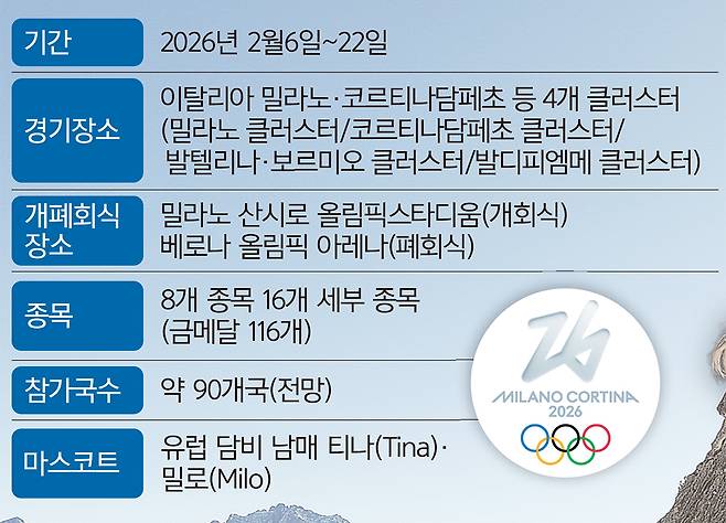 20년 만에 이탈리아에서 열리는 겨울 스포츠 축제인 제25회 동계올림픽인 밀라노·코르티나담페초 대회가 100일 뒤인 2026년 2월6일 개막해 2월22일까지 펼쳐진다. 이번 대회는 1956년 코르티나담페초, 2006년 토리노에 이어 3번째로 이탈리아에서 열리는 동계 올림픽이다. 동계 올림픽을 3회 이상 개최한 나라는 미국(4회)과 프랑스(3회)에 이어 이탈리아가 3번째다. 1960년 로마 하계 올림픽을 합치면 이탈리아는 4번째로 올림픽을 연다.