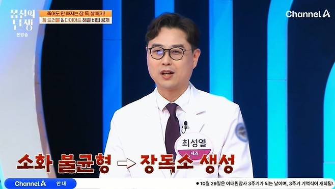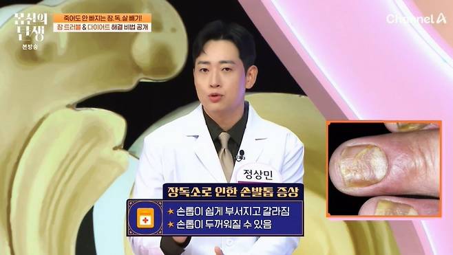 전문의는 "장은 음식물을 소화, 흡수, 배출하는 기관인데, 소화 과정이 원활하지 못해서 오히려 장독소가 만들어져서 몸을 공격하게 만들게 한다"라며 장독소가 만든 결과물이 장독살이라고 설명했다. 손톱은 영양 상태를 나타내는 지표로, 장독소가 있는 경우 손발톱이 쉽게 부서지고, 두꺼워진다고. "장독소가 염증을 유발할 때 비만, 건선, 아토피까지 영향을 준다"고 덧붙였다.