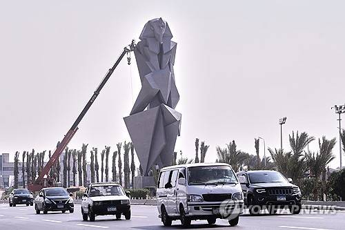 Vehicles pass under a 27 meters (89 feet) iron statue "The guard" by Egyptian artist Deyaa Awed, which will face visitors coming from Sphinx airport to the Grand Egyptian Museum in Giza, Egypt, Tuesday, Oct. 28, 2025. (AP Photo/Amr Nabil)