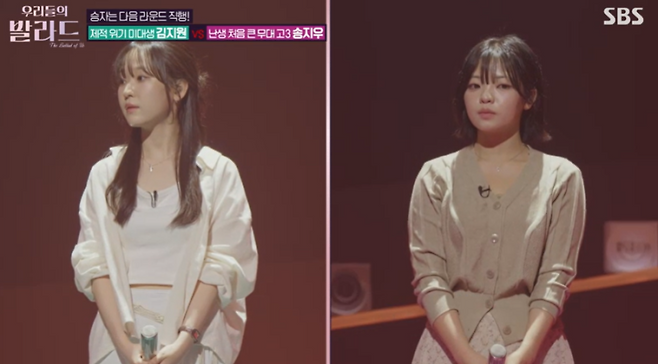 이날 ‘제적 위기 미대생’ 김지원은 1라운드 3위로 올라온 고3 송지우의 지목을 받아 ‘위로’를 주제로 발라드 대결을 펼쳤다.