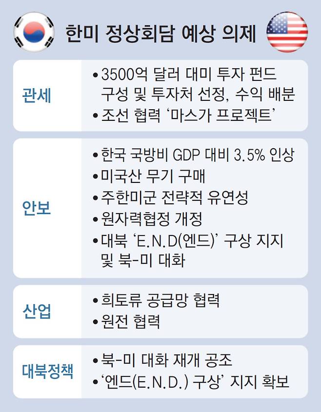 안보 분야에선 한미 원자력 협정 개정과 한국의 국방비를 국내총생산(GDP) 대비 3.5%로 인상하는 내용 등이 논의된다. 정부는 관세 협상 타결이 불발되더라도 ‘조인트 팩트시트(joint factsheet·공동 설명자료)’ 등 안보 합의문을 먼저 발표하는 방안을 미국과 조율 중인 것으로 알려졌다. 안보 분야 합의문은 8월 25일 1차 한미 정상회담 전후 조율을 마쳤지만 관세 협상 장기화로 발표가 늦춰진 것으로 전해졌다.