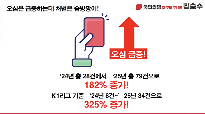 김승수 의원(국민의힘)은 국정감사에서 “올해 K리그 오심 건수가 전년 대비 182% 증가했다”고 지적했다. 김 의원실이 확보한 자료에 따르면, 2024년 28건이던 오심이 2025년에는 79건으로 급증했다.