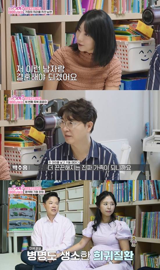 한편, 박수홍과 사유리는 '염색체 미세결실'로 발달장애와 지적 장애가 있는 첫째 딸에 이어 연년생 둘째 아들을 낳은 뒤 셋째를 임신 중인 산모와 만났다. 첫째 임신 중 산전 검사에서 아무런 이상이 없었지만, 산모는 출산 후 3일 만에 첫째의 염색체 이상을 알게 됐다. 산모는 "왜 나한테 이런 일이 생겼을까 원망하고 현실을 부정했지만, 중심을 잘 잡고 버텨준 남편 덕분에 마음을 다잡게 됐다"고 전했다. 첫째는 근육과 장기 모두 발달이 더디고 약한 상태여서 다양한 재활치료를 받고 있었다. 연년생 둘째를 낳은 뒤 산모는 "둘째 덕분에 첫째 딸의 발달 속도를 더욱 이해하게 됐고, 첫째 또한 동생과 함께하며 서로에게 좋은 자극이 되고 있다"고 밝혔다. 그렇게 더욱 끈끈한 가족이 되면서, 산모는 셋째까지 임신을 계획하게 됐다.