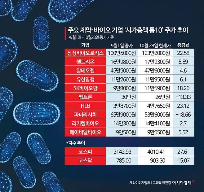29일 아시아경제가 주요 제약·바이오 시가총액 상위 10개 종목의 주가 흐름을 살펴본 결과, 9개 종목이 코스피·코스닥 지수 상승률을 밑돌았다. 성장성이 좋다고 평가받는 제약·바이오 기업들이 유례없는 수준의 강세장에서 평균 상승률에도 미치지 못했다는 의미다. 종가 기준으로 지수 상승세가 가장 가팔랐던 지난달 1일부터 이달 28일까지 기간을 기준으로 삼았는데, 같은 기간 코스피 지수는 3142.93에서 4010.41로 27.6% 오르고 코스닥 지수는 785.0에서 903.30까지 15.07% 상승했다.