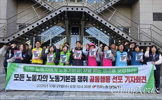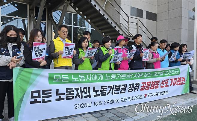 대전본부는 이날 발표한 기자회견문을 통해 "우리 사회 노동자의 절반 이상은 비정규직이며, 천만 명이 넘는 노동자들이 법적 보호를 받지 못하거나 고용 불안으로 사실상 권리를 박탈당하고 있다"며 "특히 초단시간 노동자, 5인 미만 사업장 노동자, 특수고용·플랫폼 노동자는 근로기준법의 적용조차 받지 못하고 있다"고 지적했다.