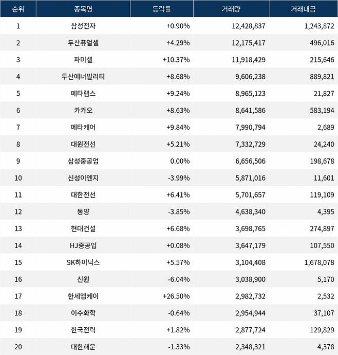 한편 거래량 상위 20위권 종목들은 대한전선(001440) ▲6.41%, 동양(001520) ▼3.85%, 현대건설(000720) ▲6.68%, HJ중공업(097230) ▲0.08%, SK하이닉스(000660) ▲5.57%, 신원(009270) ▼6.04%, 한세엠케이(069640) ▲26.50%, 이수화학(005950) ▼0.64%, 한국전력(015760) ▲1.82%, 대한해운(005880) ▼1.33% 등의 성적을 기록했다.