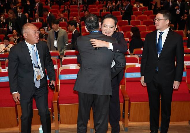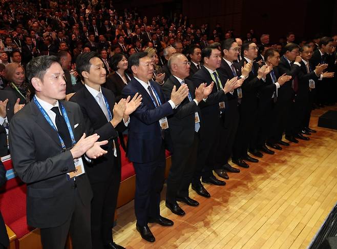 29일 경북 경주예술의전당에서 열린 'APEC CEO(최고경영자) 서밋'에서 참석자들이 박수로 이재명 대통령을 맞이하고 있다. 앞줄 왼쪽부터 정용진 신세계그룹 회장, 정기선 HD현대 회장, 신동빈 롯데그룹 회장, 정의선 현대차그룹 회장, 최태원 대한상공회의소 회장 겸 SK그룹 회장, 이재용 삼성전자 회장, 구광모 LG그룹 회장, 장인화 포스코홀딩스 회장, 허태수 GS그룹 회장