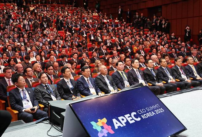 29일 경북 경주예술의전당에서 열린 'APEC CEO(최고경영자) 서밋'에서 참석자들이 이재명 대통령의 특별연설을 경청하고 있다. 앞줄 왼쪽부터 이형희 SK수펙스 위원장, 정용진 신세계그룹 회장, 정기선 HD현대 회장, 신동빈 롯데그룹 회장, 정의선 현대차그룹 회장, 최태원 대한상공회의소 회장 겸 SK그룹 회장, 이재용 삼성전자 회장, 구광모 LG그룹 회장, 장인화 포스코홀딩스 회장, 허태수 GS그룹 회장