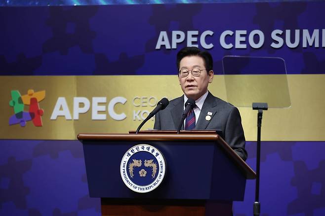 이재명 대통령이 29일 경북 경주예술의전당에서 열린 'APEC CEO(최고경영자) 서밋'에서 특별연설을 하고 있다.