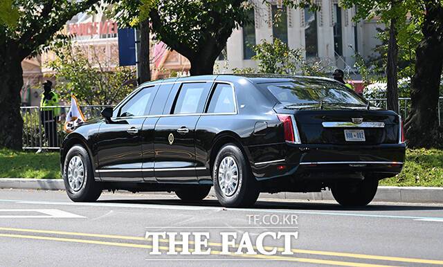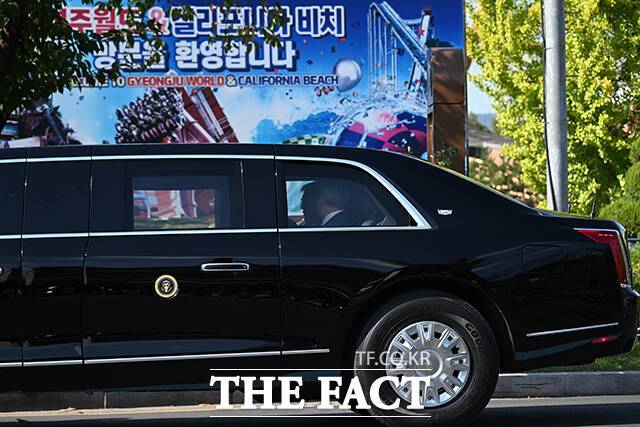 2025 아시아태평양경제협력체(APEC) 참석을 위해 국빈 방한한 도널드 트럼프 미국 대통령이 29일 오후 경북 경주에 도착해 전용 리무진 '더비스트'를 타고 APEC 서밋 장소로 이동하고 있다.
