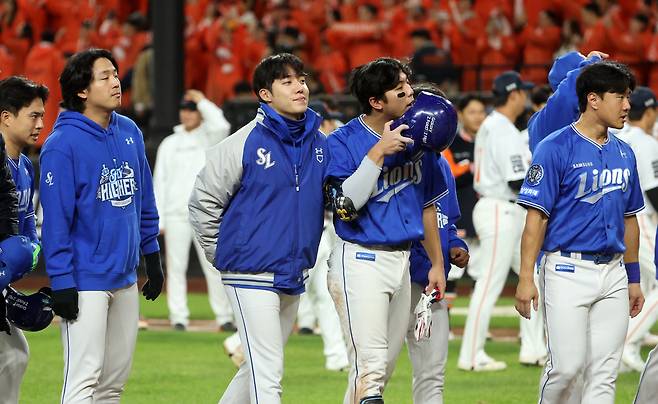 | ▲ 가을 야구 마무리 한 삼성 24일 대전한화생명볼파크에서 열린 2025 프로야구 KBO리그 포스트시즌 플레이오프 5차전 삼성 라이온즈와 한화 이글스의 경기에서 패배한 삼성 선수들이 관중에게 인사하고 있다. |