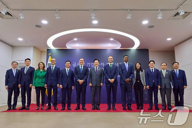 왼쪽부터 김용범 대통령실 정책실장, 강훈식 대통령 비서실장, 카레나 칸실레리 유미코아 본사 배터리사업부 대표, 니콜라 푸아리앙 에어리퀴드코리아 대표, 이진안 앰코테크놀로지코리아 대표, 맷 가먼 아마존웹서비스(AWS) CEO, 이재명 대통령, 니콜라 파리 르노 한국 CEO, 반 홀 코닝 한국 총괄사장, 뷔 트란 지멘스 헬시니어스 아태지역 CEO, 김정관 산업통상부 장관, 위성락 국가안보실장, 강경성 코트라 사장. (대통령실 제공. 재판매 및 DB 금지) 2025.10.29/뉴스1
