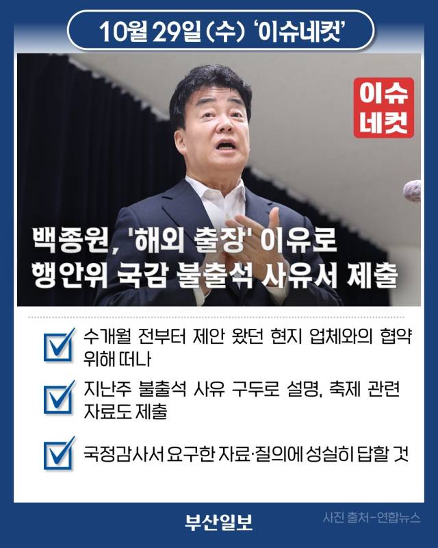 백종원 더본코리아 대표가 오는 30일 국회 행정안전위원회에 불참의사를 밝혔습니다. 국회와 식품업계에 따르면 백 대표는 지난 27일 해외 출장을 사유로 국감에 출석할 수 없다는 사유서를 제출했습니다. 더본코리아 관계자는 "백 대표는 수개월 전부터 제안이 왔던 동남아시아와 중국, 미국 등 현지 업체와의 K소스 협약을 위한 해외 출장으로 부득이하게 불출석 이유서를 냈다"고 전했했습니다. 이어 "지난주에 이해식 의원실에 불출석 사유를 구두로 설명했고, 부사장과 해당 업무 담당자가 두 차례 의원실에 방문해 지역 축제와 관련된 자료를 제출했다"고 설명했습니다. 당초 백 대표는 국회 행안위 국감에 증인으로 출석해 지역축제 관련 의혹 및 법규 위반 사항에 대한 질의를 받을 예정이었습니다. 더본코리아 관계자는 "수개월 전 조율된 해외 출장 일정으로 부득이하게 불출석 이유서를 제출했지만, 국정감사에서 요구한 자료와 질의에는 성실히 답을 전하겠다"고 덧붙였습니다.