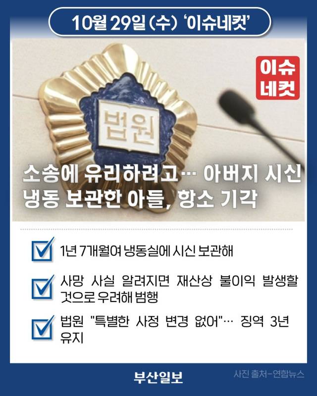 부친의 사망 사실을 숨기고 시신을 1년 7개월간 냉동고에 보관한 40대 아들의 항소가 기각됐습니다. 29일 수원지법 형사항소4부는 사기 및 사체은닉 등 혐의를 받는 A 씨와 검찰의 항소를 기각하고 징역 3년을 선고한 원심 판결을 유지했습니다. A 씨는 2023년 4월 경기 이천시에서 홀로 사는 70대 아버지의 집에 방문했다가 아버지가 숨져 있는 것을 발견하고도 사망신고를 하지 않은 채 시신을 숨긴 혐의를 받습니다. 그는 아버지 사망 사실이 알려질 경우 2022년 7월부터 아버지와 의붓어머니 사이에서 진행 중인 이혼 및 재산분할 소송 등에서 재산상 불이익이 발생할 것을 우려해 범행한 것으로 조사됐습니다. 민법상 소송 진행 도중 당사자가 사망하면 다른 사람이 이를 대신할 수 있다는 규정이 없기 때문에 소송은 종료됩니다. 이 경우 남은 배우자가 상속의 권리를 가집니다. A 씨의 범행 이후에도 아버지와 의붓어머니 사이의 소송은 법률대리인을 통해 계속 진행됐고, 아버지 사망 1년 만인 지난해 4월 대법원의 확정판결이 내려졌습니다. A 씨는 지난해 10월 친척에 의해 아버지의 실종 신고가 접수돼 경찰 수사가 시작되자 이로부터 한 달여 만에 자수했습니다. 항소심 재판부는 "원심 판결 이후 원심 형을 변경할만한 특별한 사정 변경이 보이지 않는다"며 "기록에 나타난 모든 양형 조건을 종합해봐도 원심의 형이 재량 범위에서 벗어났다고 보이지 않는다"고 밝혔습니다.