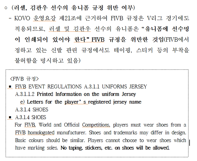 아울러 "한국전력에서 제기한 'FIVB 규정 A.3.1.1.2 Printed Information on the uniform Jersey'에 대해 당 연맹의 해석은 '유니폼 내에 번호, 로고, 국가명, 이름 등이 아래의 기준에 맞게 표기되어 있어야 된다'고 해석했고 대한배구협회에 확인한 결과 해당 규정은 당 연맹의 해석과 동일하다는 의견이었다"고 설명했다.