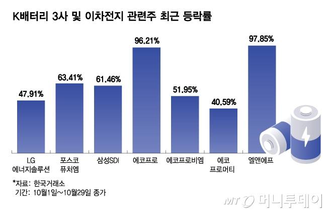 29일 한국거래소에 따르면 이달 들어 (10월1일~29일 종가) 이차전지 소재 업체인 엘앤에프는 97.85% 급등했다. 이 밖에도 에코프로 (등락률 96.21%), 에코프로비엠 (51.95%), 에코프로머티 (40.59%), 포스코퓨처엠 (63.41%), LG에너지솔루션(47.91%), {삼성SDI)(61.46%) 등 이차전지 관련주가 일제히 상승했다.