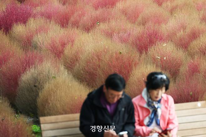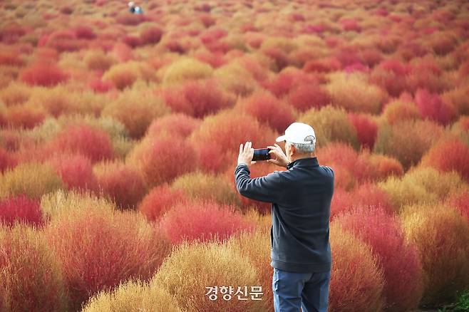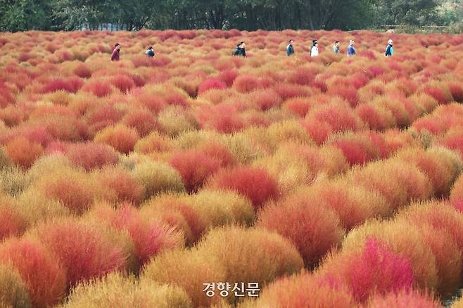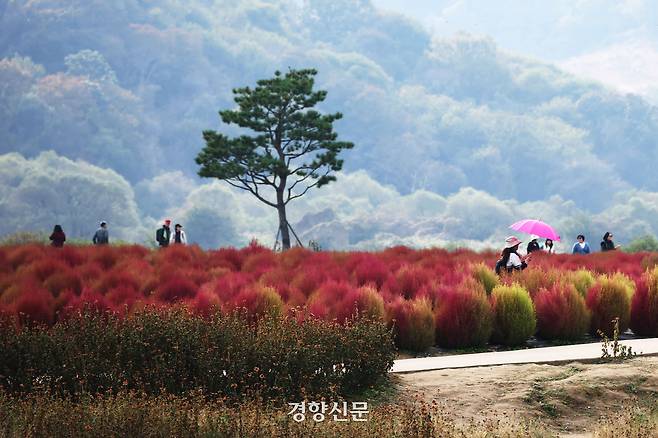 전국에 찾아왔던 때 이른 추위가 29일 낮부터 누그러졌다. 경기 연천군 임진강 댑싸리정원을 찾은 시민들은 붉게 물든 댑싸리 사이를 거닐며 완연한 가을을 만끽했다.