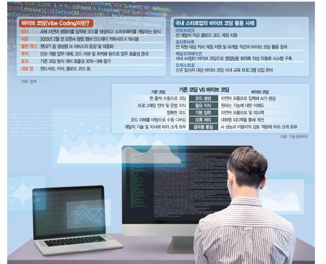국내 IT 스타트업들도 바이브 코딩을 적극적으로 받아들이고 있다. 포티투마루는 올해 3월부터 전 직원을 대상으로 AI 코드 에디터 커서 유료 계정을 지원하기 시작했다. 아울러 비개발 직군에 커서 활용을 장려하는 중이다. 채널코퍼레이션은 사내 인공지능 전환(AX)팀이 바이브 코딩으로 영업팀의 회의록 작성 자동화 시스템을 구축했다. 이 시스템 덕에 영업팀 직원들은 한 주에 4시간 가까이 써야 했던 회의록 작성 업무를 AI에게 대신 맡기게 됐다. 오케스트로는 신규 입사자를 대상으로 바이브 코딩 활용법을 가르치는 사내 교육 프로그램을 준비하는 중이다.