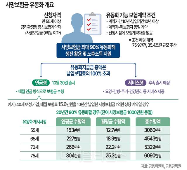사망보험금 유동화 상품이 30일 첫 선을 보인다. 본인이 사망한 후에만 탈 수 있는 보험금을 생전에 연금처럼 탈 수 있는 것이다. 보험 가입자들은 사망보험금 일부를 미리 받아 노후 생활비로 활용할 수 있게 됐다.
