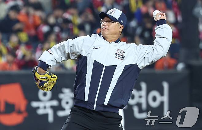 (대전=뉴스1) 김도우 기자 = 한화 이글스의 1999년 한국시리즈 우승을 이끈 구대성이 29일 대전 한화생명볼파크에서 열린 프로야구 2025 신한 SOL뱅크 KBO 포스트시즌 한국시리즈 3차전 LG 트윈스와 한화 이글스의 경기에 앞서 시구를 하고 있다. 2025.10.29/뉴스1