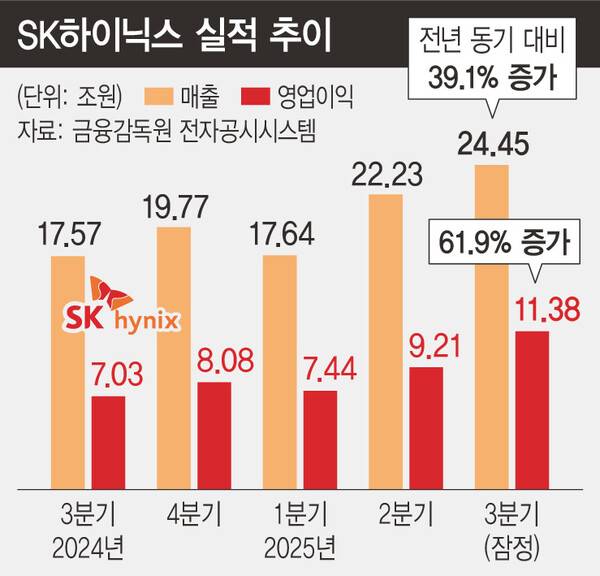 에스케이(SK)하이닉스가 올해 3분기에 영업이익 10조원을 돌파한 것은 인공지능(AI) 열풍으로 고대역폭메모리(HBM) 판매 호조에 따른 영향으로 풀이된다.