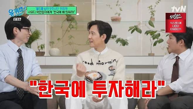 사우디 억만장자와 만난 이정재는 "한마디 했냐"는 질문에 "한국에 투자하라고 했다. 한국으로 지금 물이 들어오고 있다. 한국에 배를 띄워야 한다. 찐하게 얘기했다"라고 말하며 뿌듯해했다. 이정재는 현지 반응에 대해 "긍정적인 반응이었다"라고 말했다. 이를 들은 유재석은 "내 친구가 이런 일을 하는지 몰랐네. 대한민국 엔터 업계를 위한 투자 유치를 하고 다녀"라고 감탄했다.
