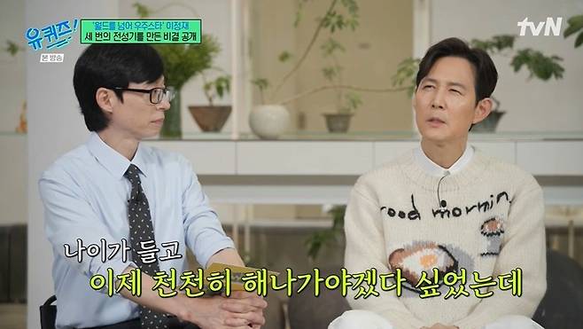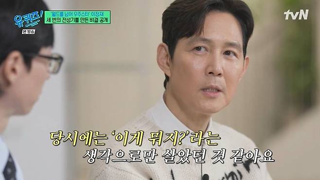 데뷔 33년 차인 이정재는 세 번의 전성기에 관해 "사실 아직도 믿어지지 않는다. '모래시계'로 배우 생활을 시작한 거나 마찬가지였다. 당시엔 '이게 뭐지?'란 생각으로만 1년을 살았다. 나이 들고 천천히 해야겠단 생각을 하고 있을 때 '관상'이 큰 성공을 했다"라고 전했다.