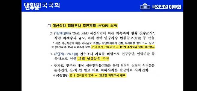 이 의원은 R&D 예산 삭감으로 인한 연구자 피해 전수조사 계획도 질의했다. 과기정통부는 이번 조사 결과를 토대로 제도 개선과 후속 지원책을 마련할 예정이다.