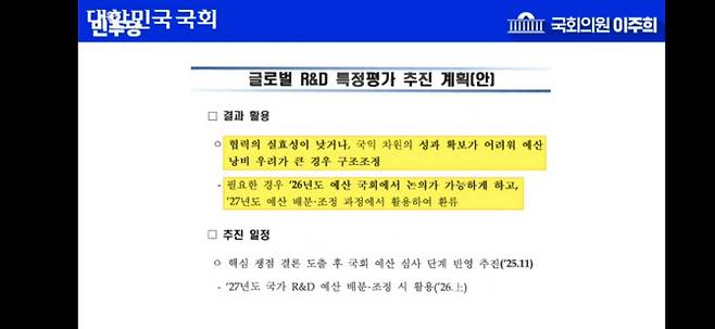 29일 국회 과학기술정보방송통신위원회 국정감사에서 이주희 더불어민주당 의원은 윤석열 정부의 R&D(연구개발) 예산 삭감 과정에서 공무원들이 오히려 포상을 받은 사실을 언급하며 "국민 피해를 초래한 정책을 공적으로 치하하는 일은 있어서는 안 된다"고 지적했다.