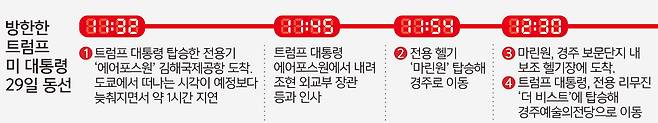 트럼프 대통령은 이날 일본 방문 일정을 마친 뒤 전용기 에어포스원을 타고 오전 11시32분쯤 부산 김해국제공항을 통해 입국했다. 에어포스원은 F-16 전투기 두 대의 호위를 받으며 한국 상공에 들어왔다.