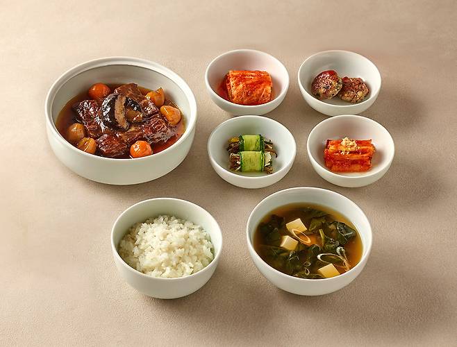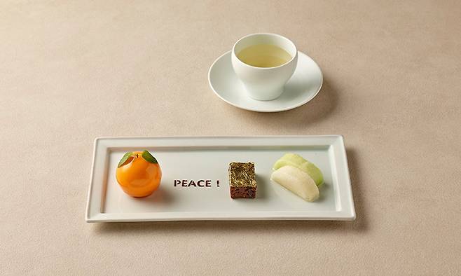 | 갈비찜과 디저트 29일 한·미 정상회담 오찬 및 디저트 메뉴. 미국산 갈비를 쓴 갈비찜 등이 메인 식사로 올랐고 ‘평화’를 뜻하는 영단어 ‘PEACE’를 레터링한 감귤 디저트가 제공됐다. 대통령실 제공 |