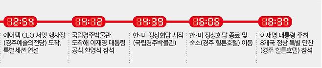 한·미 양국의 이목이 쏠린 정상회담은 역사적 상징성을 지닌 국립경주박물관에서 진행됐다. 황금빛 넥타이 차림의 이재명 대통령은 전통 취타대의 선도·호위 속에서 입장하는 트럼프 대통령을 국립경주박물관 천년미소관 앞에서 맞이했다. 이 대통령의 황금빛 넥타이는 황금색을 좋아하는 트럼프 대통령의 취향을 반영해 특별 제작된 것으로, 훈민정음 문양도 새겼다.
