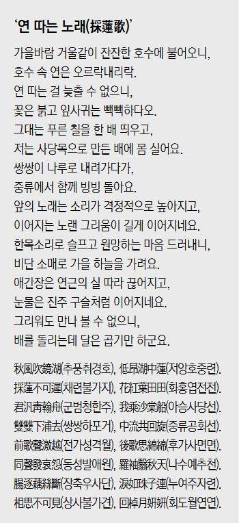 치치가 연극을 어떻게 풀어가야 하는지 잘 알고 있었던 것처럼, 위 시도 전통적인 ‘연 따는 노래’란 주제를 능숙하게 소화해 펼쳐낸 사례다. 연을 따는 것은 본래 중국 강남지방의 옛 풍속인데, 시 속의 이미지와 모티프들은 모두 ‘연 따는 노래’(‘江南’, ‘採蓮曲’ 등)의 전형들을 솜씨 좋게 재구성한 것이다. 시인은 연 따는 여성에게 은연중 자신의 감정을 투영한 듯하지만 그것이 정확히 어떤 의중인지는 알 수 없다. 다만 여성의 목소리로 임에 대한 그리움을 아련하게 노래한 시인의 과거가 무뢰한이었단 사실은 그 자체로 흥미롭다.