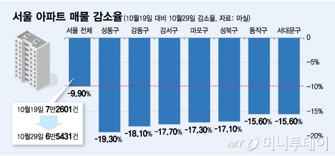 29일 부동산 빅데이터 플랫폼 아실에 따르면 서울 전체 아파트 매물은 서울 전역이 토허제로 지정되기 직전인 지난 19일 7만2601건에서 이날 6만5431건으로 9.9%(7170건) 감소했다.
