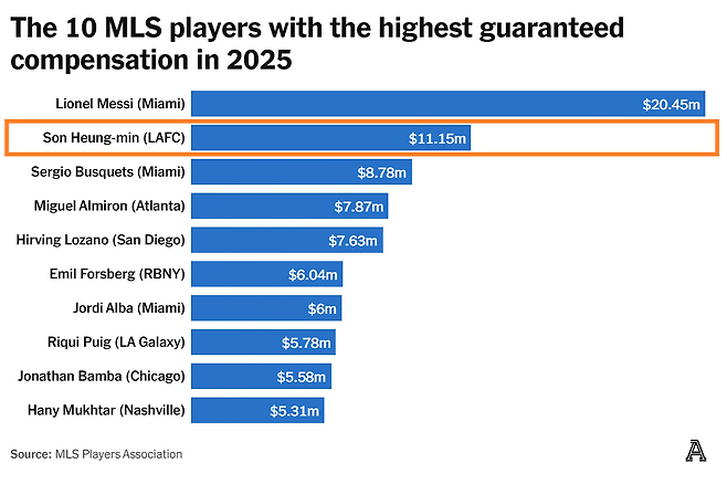 '손세이셔널' 손흥민(33·로스앤젤레스 FC)은 최고 연봉자인 '축구의 신' 리오넬 메시(38·인터 마이애미) 다음으로 MLS에서 많은 연봉을 받는 것으로 밝혀졌다.