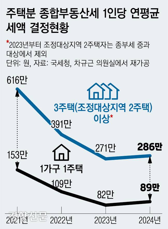 3주택 이상 다주택자(6만206명)의 평균 종부세는 2021년 616만원에서 지난해 286만원으로 약 54% 가량 급감했다. 종부세의 실질적 누진성이 무너졌다는 비판이 나오는 배경이다.