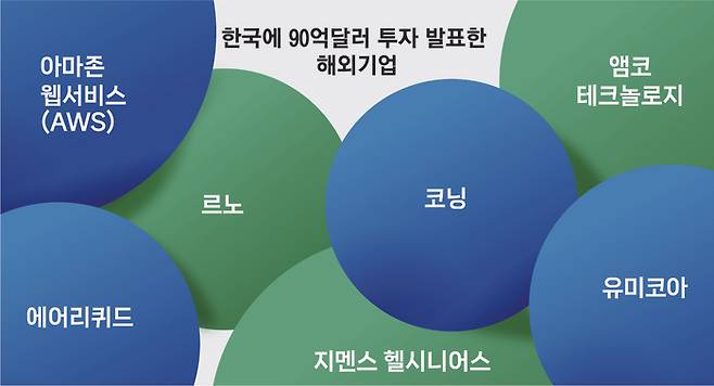 산업통상부는 이날 경주예술의전당에서 ‘글로벌 기업 투자 파트너십’ 행사를 열고 아마존웹서비스(AWS), 르노코리아, 코닝, 앰코테크놀로지, 에어리퀴드, 지멘스 헬시니어스, 유미코아 등 7개 글로벌 기업이 한국에 향후 5년간 90억달러를 투자한다고 밝혔다. 단기간 내에 유입될 외국인직접투자(FDI)는 6억6000만달러 규모다.